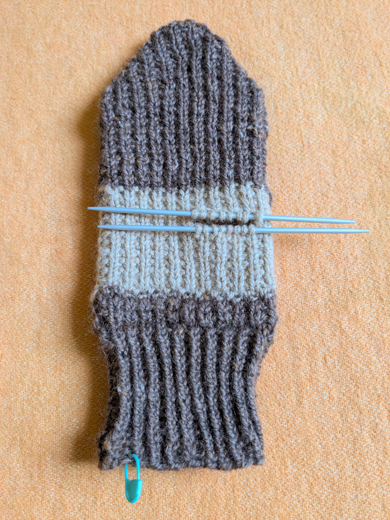 Mit dem Daumen habe ich nun weiter gestrickt…den Hilfsfaden vorsichtig aufgezogen und die Maschen auf zwei Nadeln geschoben und mache nun weiter. Ein Video zu dem Thema fand ich im Internet bei Maschenfein.