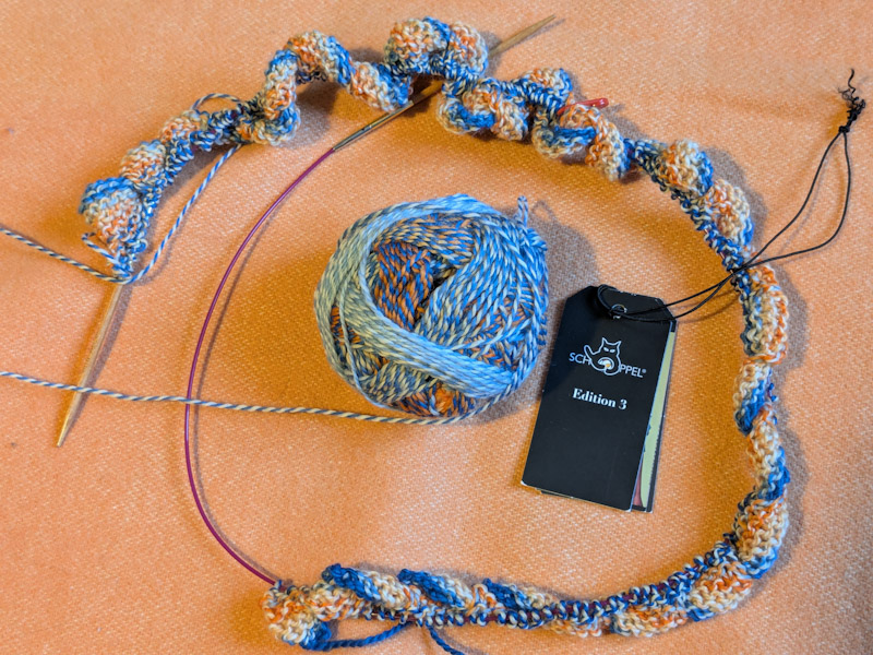 Gestern nahm ich mir also ein Knäuel von meinem Lieblinggarn „Zauberball Schoeppel Edition 3 Farbe ipanema Beach und legte los…