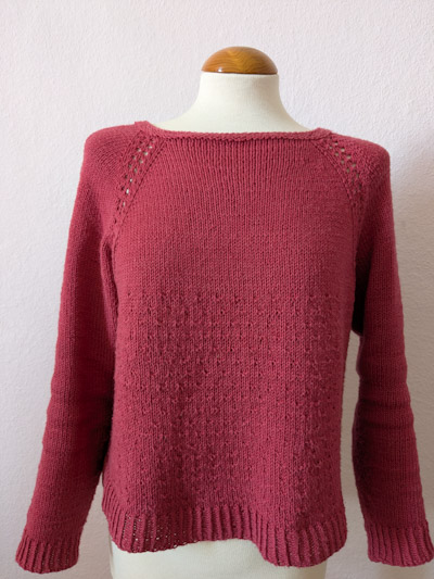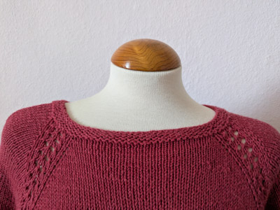 Das Bauchweg-Shirt von Strickhoernsche auf YouTube hatte mich eher interessiert wegen der schönen Lochmuster-Raglanlinie und dem versetzten Muster im Rumpfteil als wegen des „Bauchwegeffekts“. Mein Bauch ist zum Glück schon etwas geschrumpft.